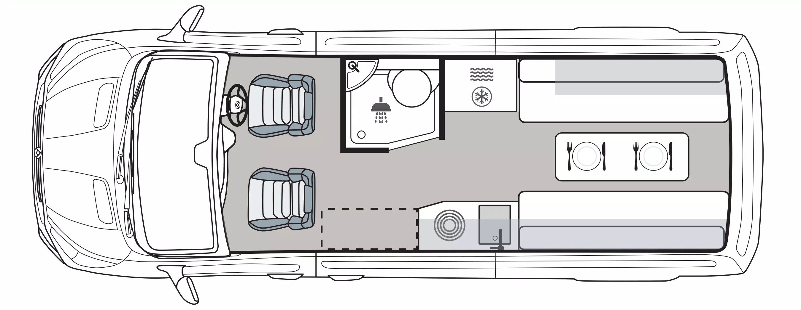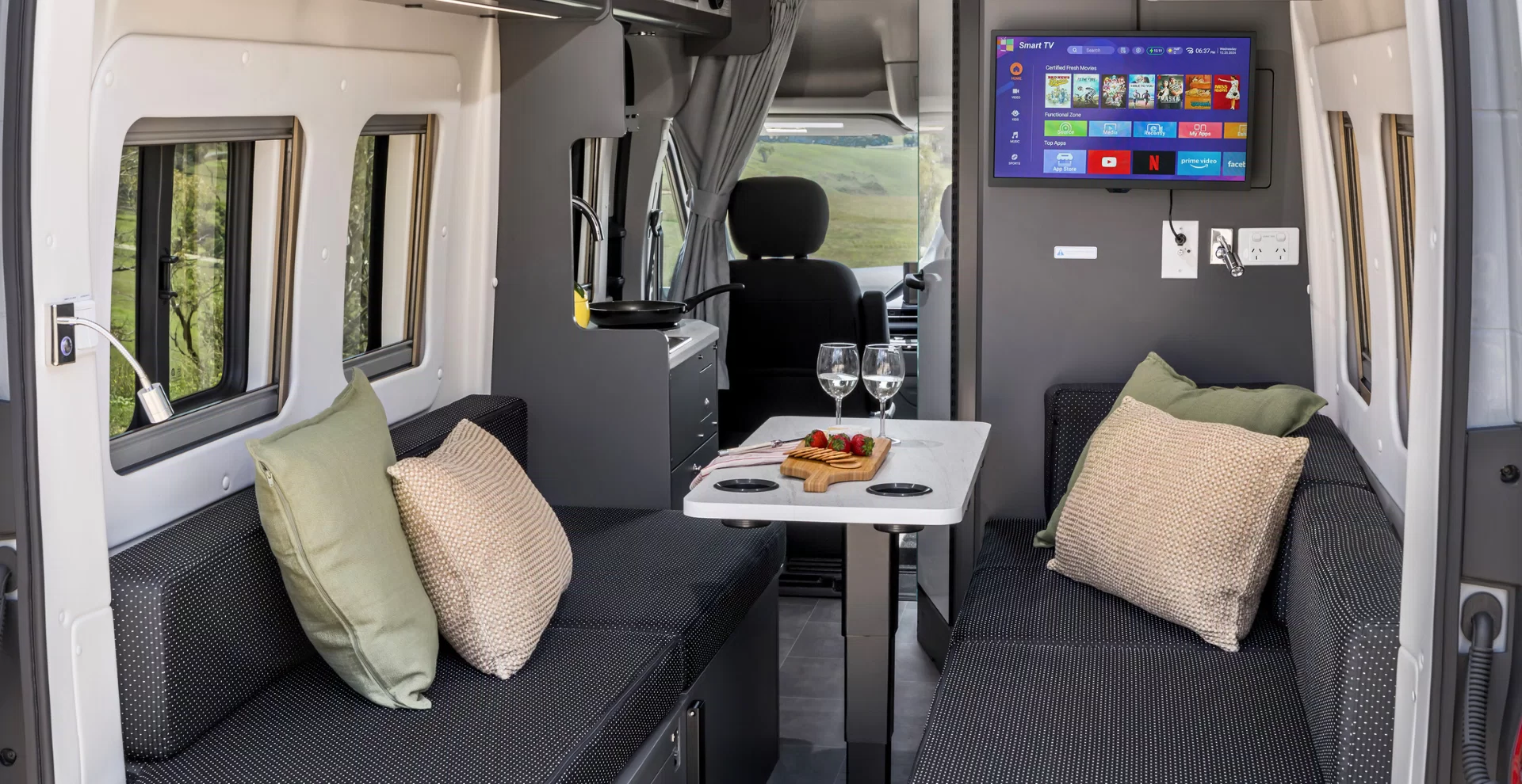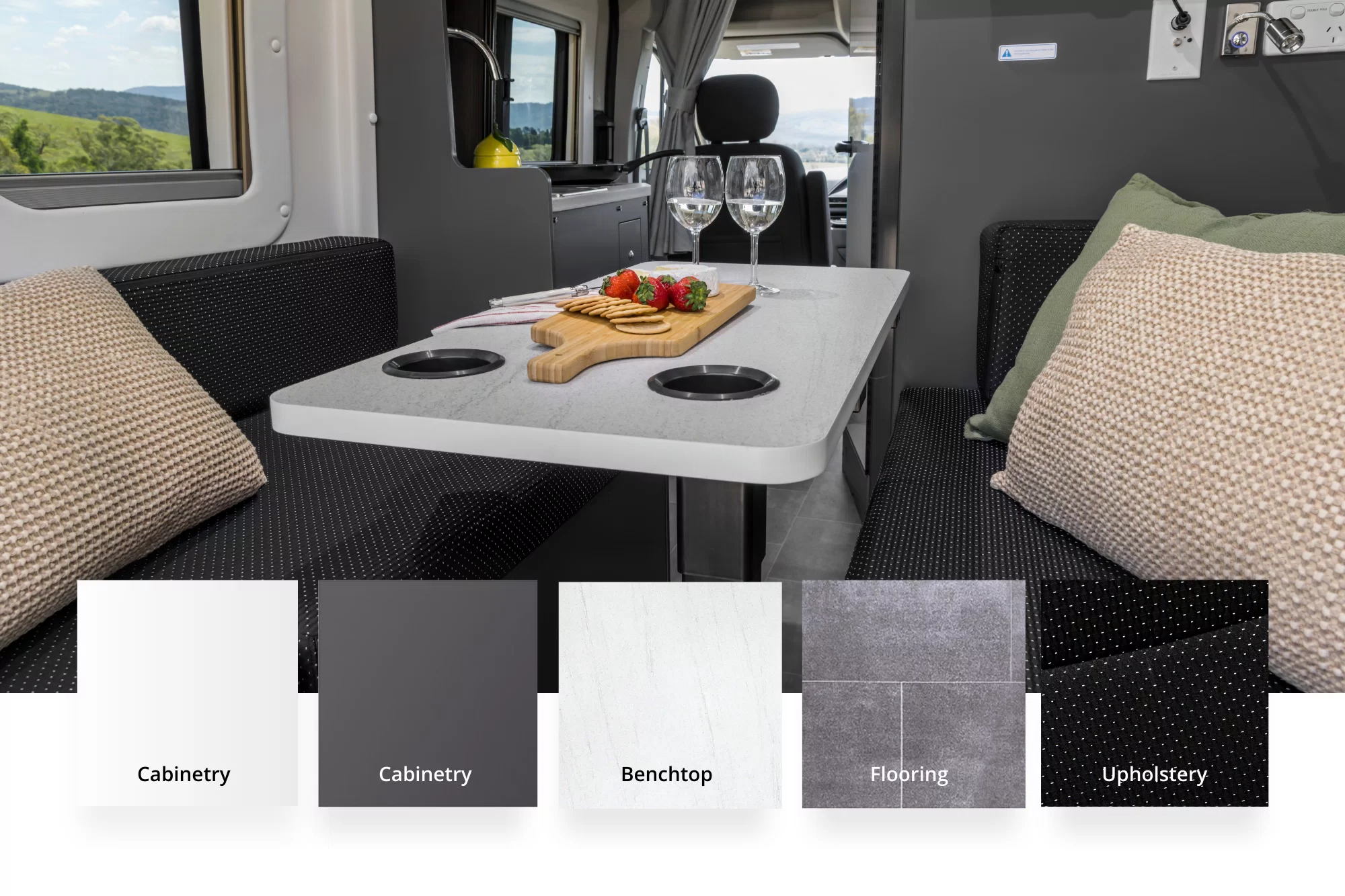 For long-lasting style, the Deliver 9 Campervan comes with a modern, neutral interior colour scheme for your benchtop, cabinetry, flooring and upholstery.