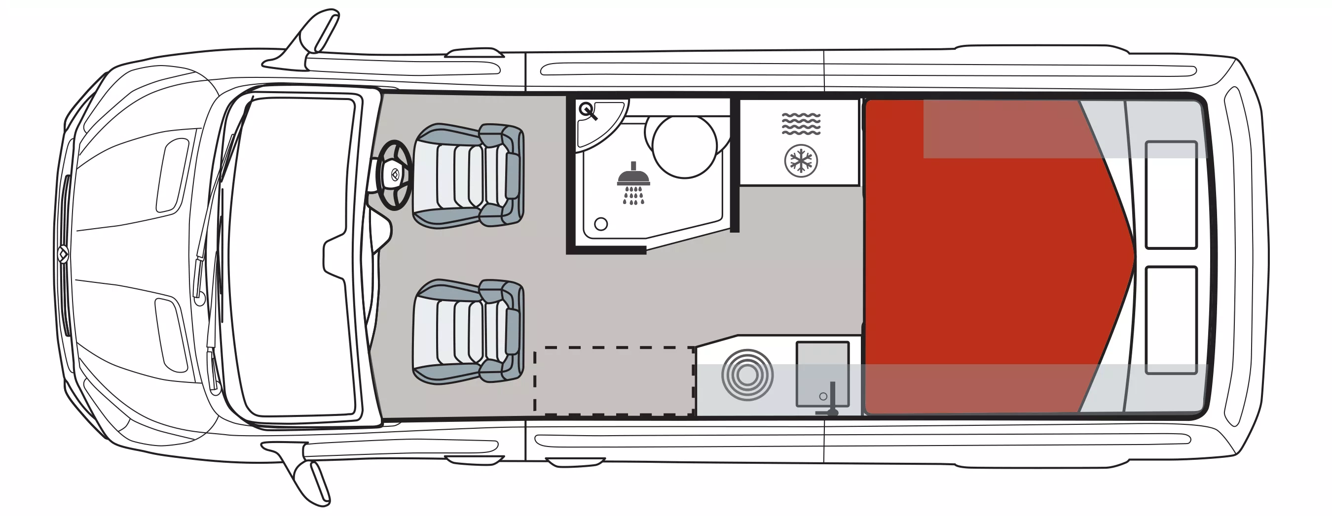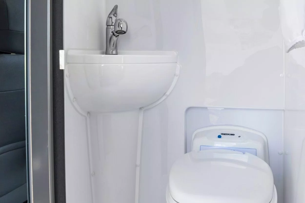 Every Deliver 9 Campervan has a bathroom with cassette type toilet, shower, sink and tap.