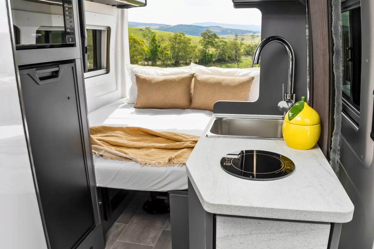 Meals on the road are made simple with a kitchen complete with a single cooktop, cabinetry, storage, sink, tap plus a handy retractable benchtop for extra prep space.